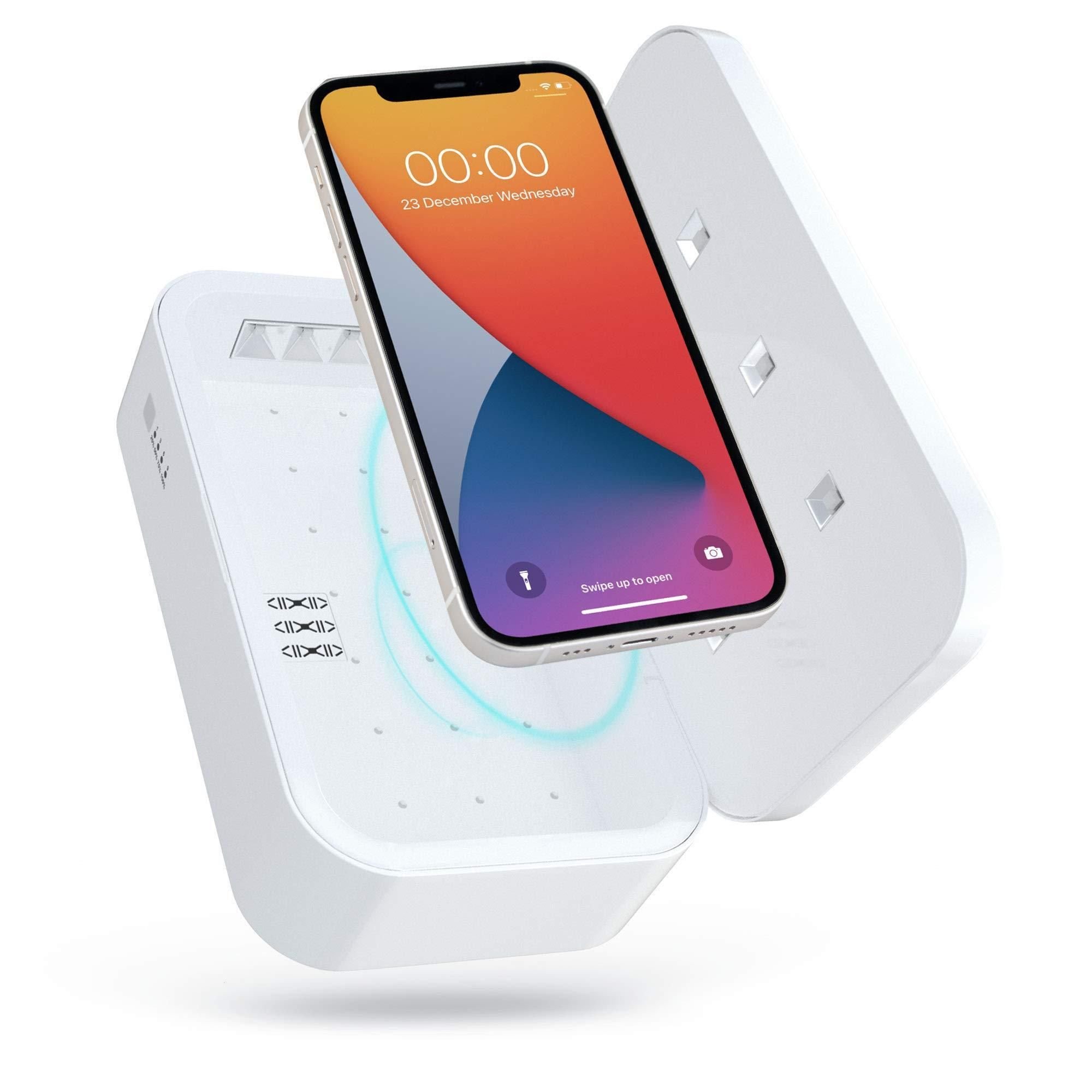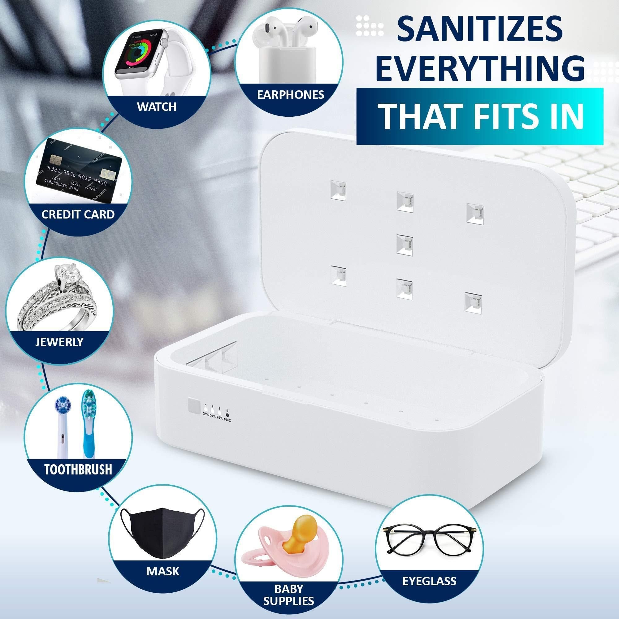 2.eco-friendly, modern, and easy our cell phone sanitizer box, 8 by 4 by 1.3 inches, is made of non-toxic recyclable materials. the charger surface is covered with soft and beautiful pacific blue colored eco-leather, which prevents your phone from slipping. just put whatever you want to clean inside the box and put your cell phone on top to charge. it is that easy